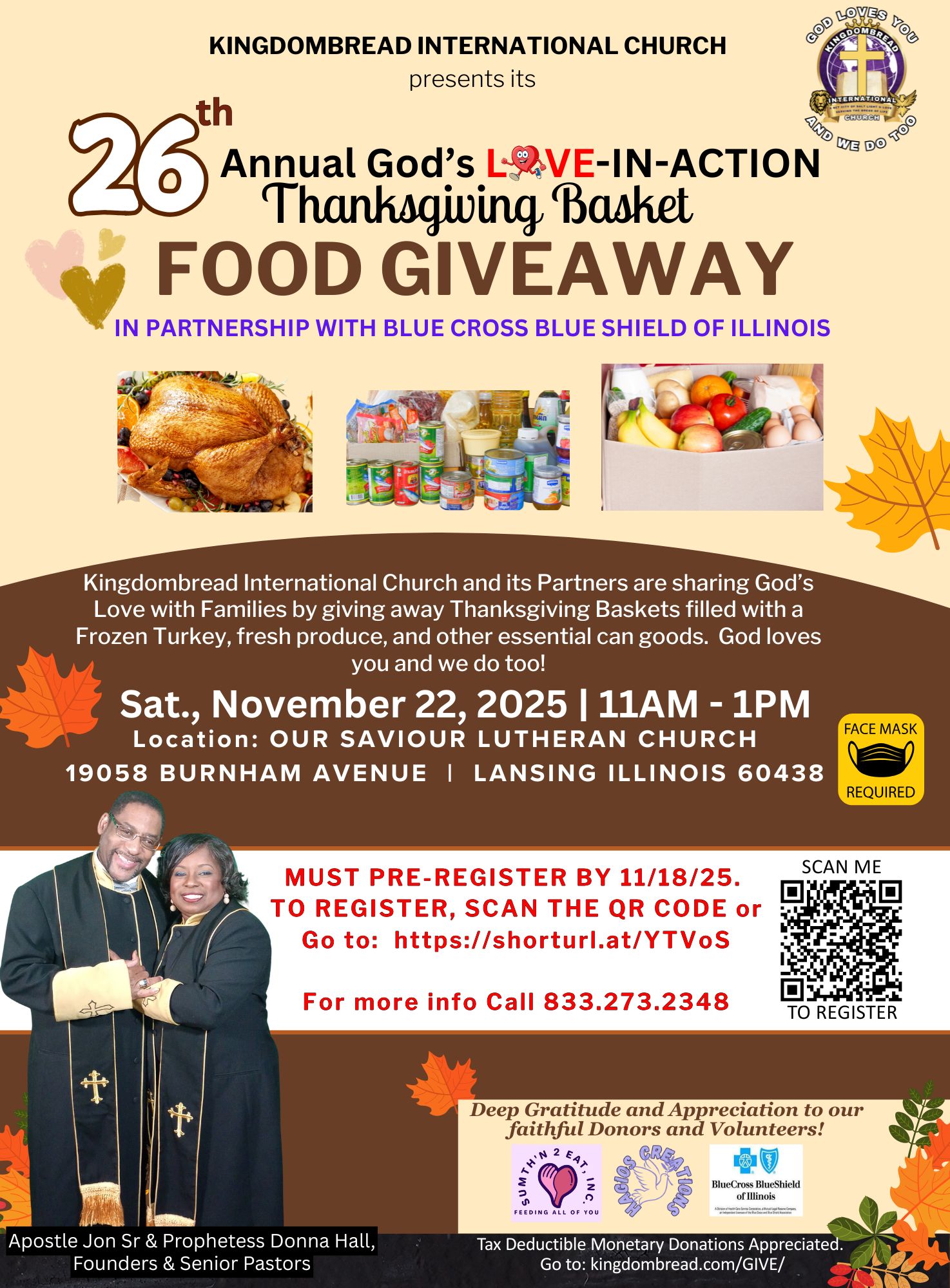 Please fully complete the online form below to register for our upcoming 26th Annual God's Love-In-Action Thanksgiving Basket Food Giveaway! Sat. 11/22/25 @ 11 AM - 1PM. Location: Our Savior Lutheran Church, 19058 Burnham Avenue, Lansing IL 60438.  ONLY COMPLETED FORMS WILL BE APPROVED. First come, First served, For immediate assistance, please call +1 833-273-2348. Shalom